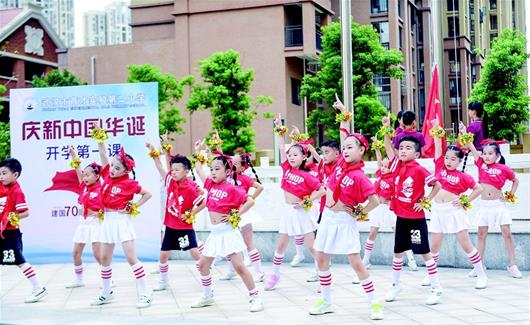 不少学校的开学第一课创意十足。蔡甸区奓山中心小学师生欢聚在学校操场,举行以“礼赞新时代喜迎军运会砥砺我奋进”为主题的开学典礼。由468名小学生组成的队列造型惊艳全场:360名学生组出心形图案,108名学生组出“70”数字造型,加上“祖国您好”的标牌,表达了师生们对新中国70华诞的美好祝福。