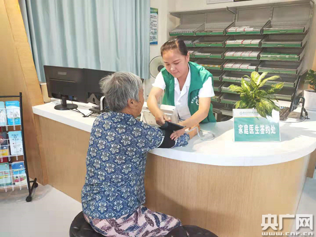 图为黄州区建新社区卫生服务站医务人员在为患者量血压 央广网记者黄炎秋 摄