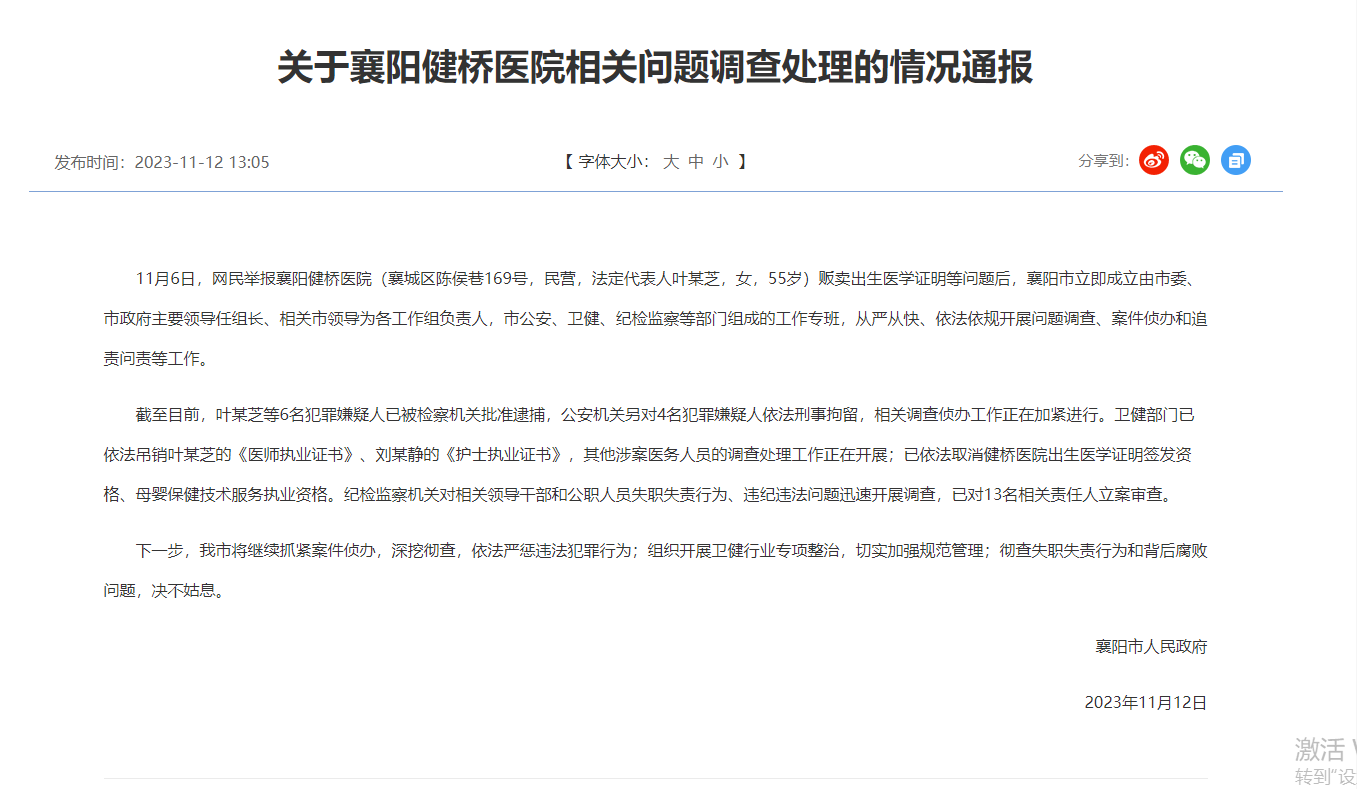 央广网襄阳11月12日消息(记者张卓 见习记者赵玲)11月12日,湖北襄阳市政府发布关于襄阳健桥医院相关问题调查处理的情况通报,11月6日,网民举报襄阳健桥医院(襄城区陈侯巷169号,民营,法定代表人叶某芝,女,55岁)贩卖出生医学证明等问题后,襄阳市立即成立由市委、市政府主要领导任组长、相关市领导为各工作组负责人,市公安、卫健、纪检监察等部门组成的工作专班,从严从快、依法依规开展问题调查、案件侦办和追责问责等工作。