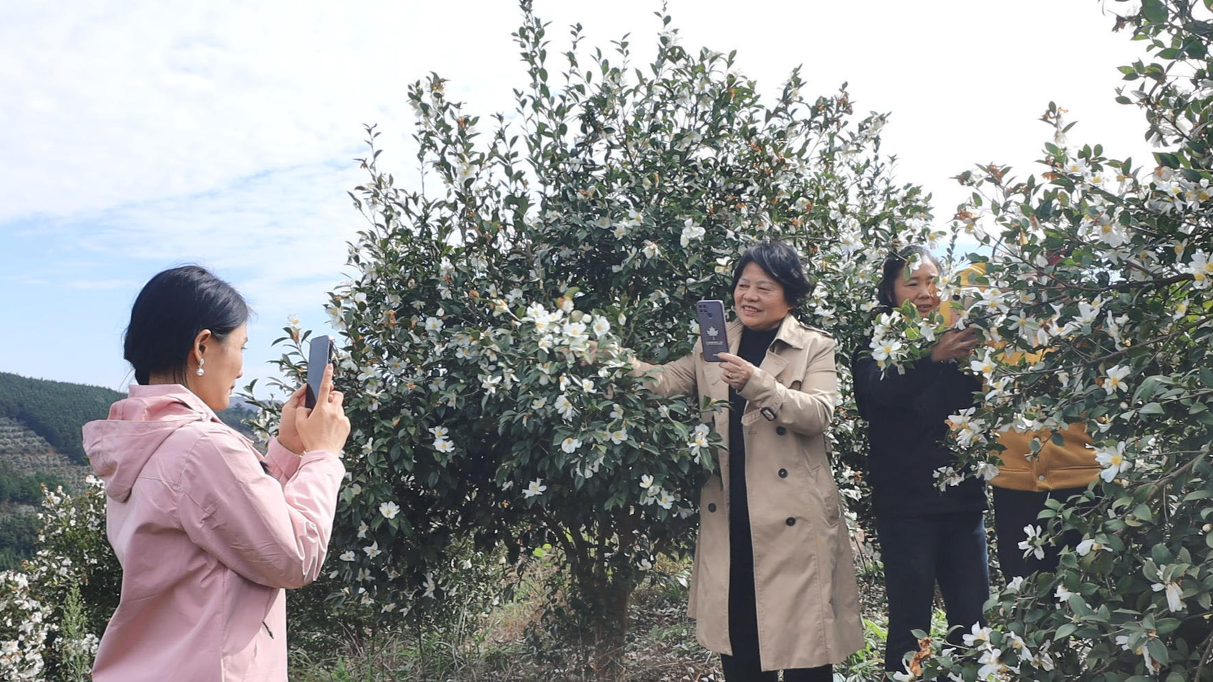 湖南新宁:万亩油茶花开雪满山 冬日山村游客醉花间
