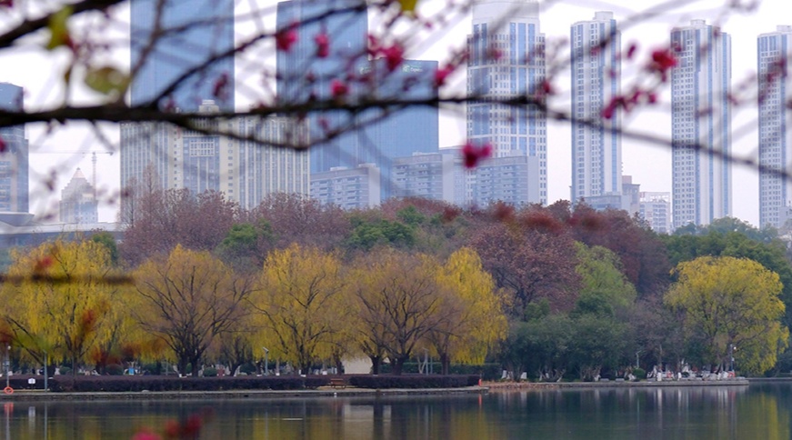 湖南烈士公园,落叶乔木与清澈湖面相映成趣,静谧优美的环境吸引市民前来散步小憩。