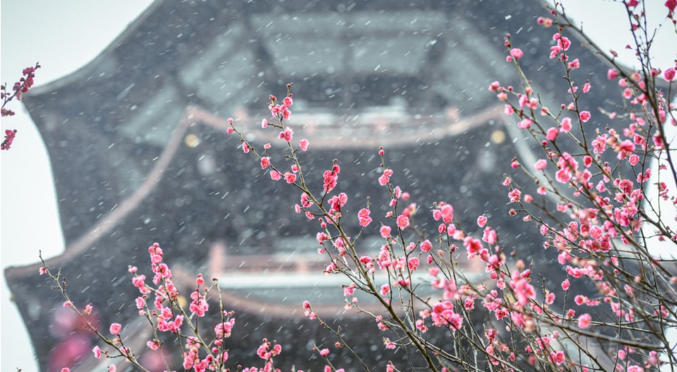 游人们踏雪而来,在花影雪光间驻足留影,在纷飞雪花里邂逅限定版冬日浪漫。