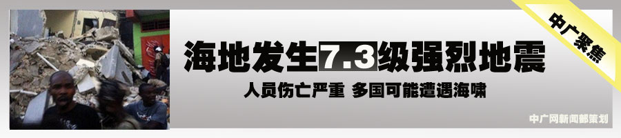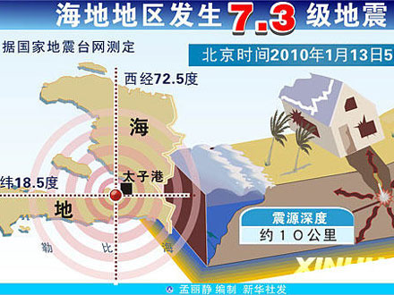 海地发生里氏7.0级地震 或引发海啸 美国地质勘探局先前初步测定地震级别为7.3级,震中位于距海地首都太子港16公里处,震源深度为10公里。 【详细】
