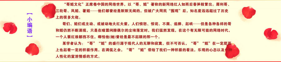 芙蓉姐姐 堪称哥姐届元老人物,星运更如南极仙翁,2004年出道至今依然火爆,足为各位哥姐奋斗的目标。 芙蓉姐姐原名史恒侠(据说也叫林可),又名火冰可儿、清水芙蓉、水媚妖姬、黑桃皇后,1977年7月19日出生于陕西省武功县一个普通职工家庭。 2004年,芙蓉姐姐横空出世,以绝对的“自信”和“骄傲”展现真实的自己,凭着她的“独特和执著”,在网络世界引起了巨大轰动,并且影响逐渐由高校BBS扩展到广大传媒,芙蓉姐姐连续3年笑傲百度搜索风云榜冠军,更是被各大媒体称为“前无古人,后无来者”。 [近况] |