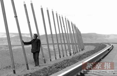 进入西大滩冻土区,铁路路基两旁插有一排排碗口粗细、高约2米的铁棒。铁棒间相隔两米,一直向前延伸。