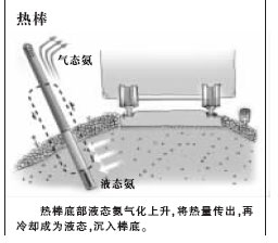 热棒的工作原理很简单:当路基温度上升时,液态氨受热发生气化,上升到热棒的上端,通过散热片将热量传导给空气,气态氨由此冷却变成了液态氨,又沉入了棒底。