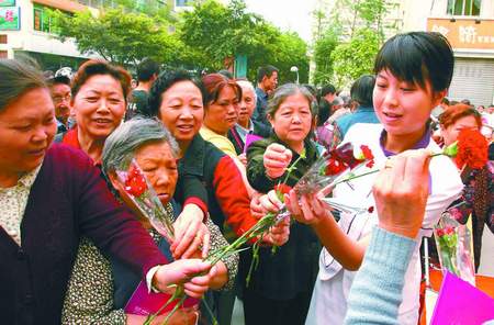 中广网北京5月13日消息 今日是母亲节,是孩子们向妈妈送上祝福的温馨日子。而在昨日上午9时,在经过两天的运筹准备后,由本报主办、维多利亚女子医院协办的“2007我为母亲送健康公益活动”之现场义诊活动在肖家河正街社区内热热闹闹地开始了。一时间,锣鼓喧天,彩带满天,参与现场义诊的维多利亚女子医院院长焦书印和几名妇科专家喜气洋洋地在社区妈妈们组成的腰鼓队的迎接下,走向义诊席,面带微笑地为早已排队等候在此的百余名妈妈义诊。“医生,我这几天老是腰疼。”“医生,我就是想量下血压”……中午12时,短短3个小时的义诊时间已经过去了,但社区妈妈们的热情依旧高涨,医生们也极为敬业,尽管顶着正午烈日,但他们的语气仍然轻柔,态度温和,其敬业认真的工作态度得到了现场妈妈的一致好评。