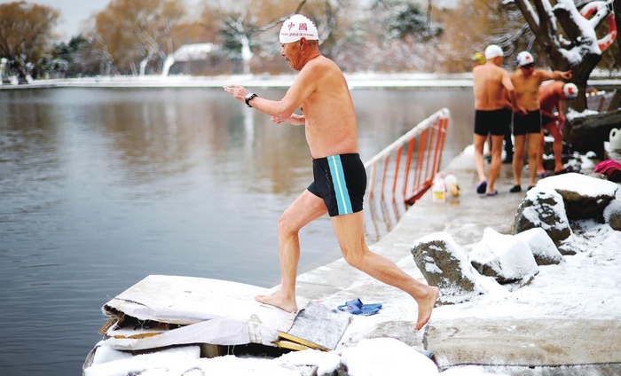雪后,冬泳爱好者开始享受别样的冬泳快乐。