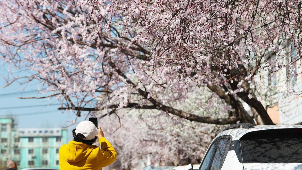 3月27日,朝阳市双塔区红星路沿线的景观桃树进入盛花期,一树树粉白相间的桃花缀满枝头。
