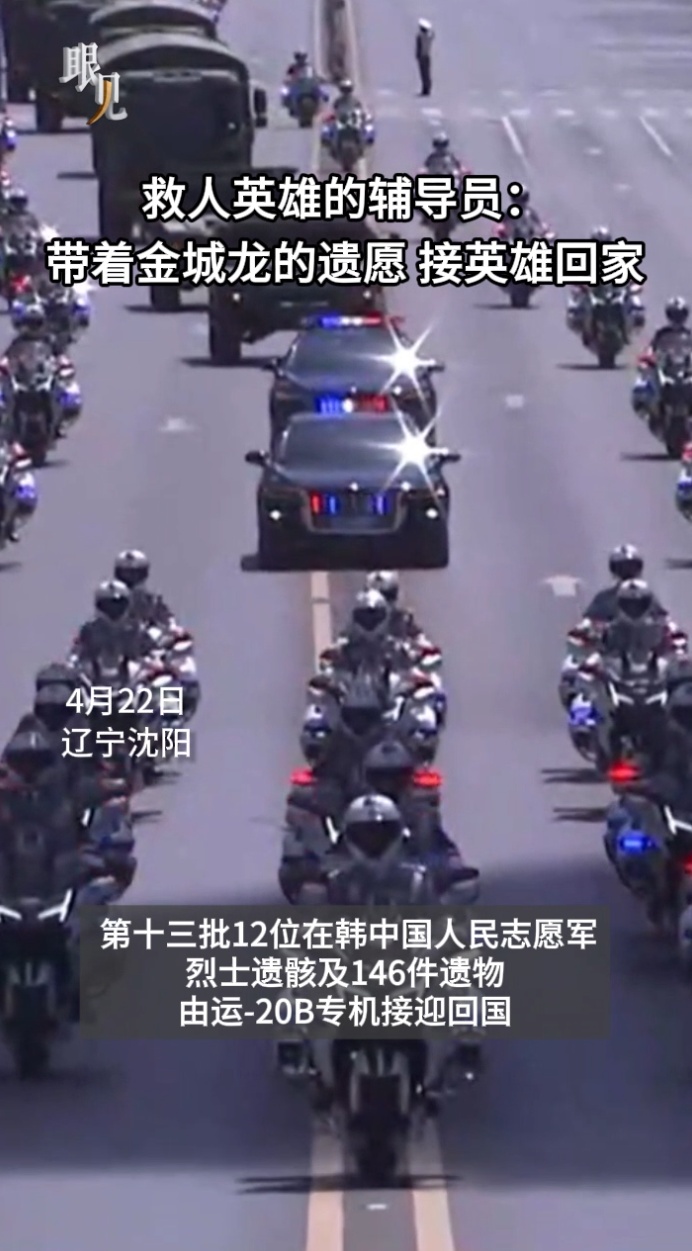 4月22日,第十三批在韩中国人民志愿军烈士遗骸迎回仪式在辽宁沈阳举行。救人英雄金城龙的辅导员,带着金成龙的遗愿 ,迎接英雄回家。