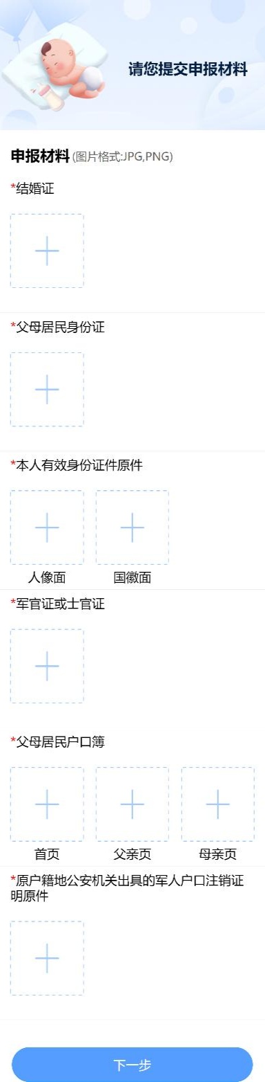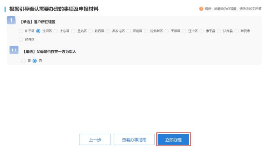 选择申报区县与父母是否为军人情况;