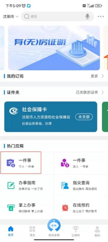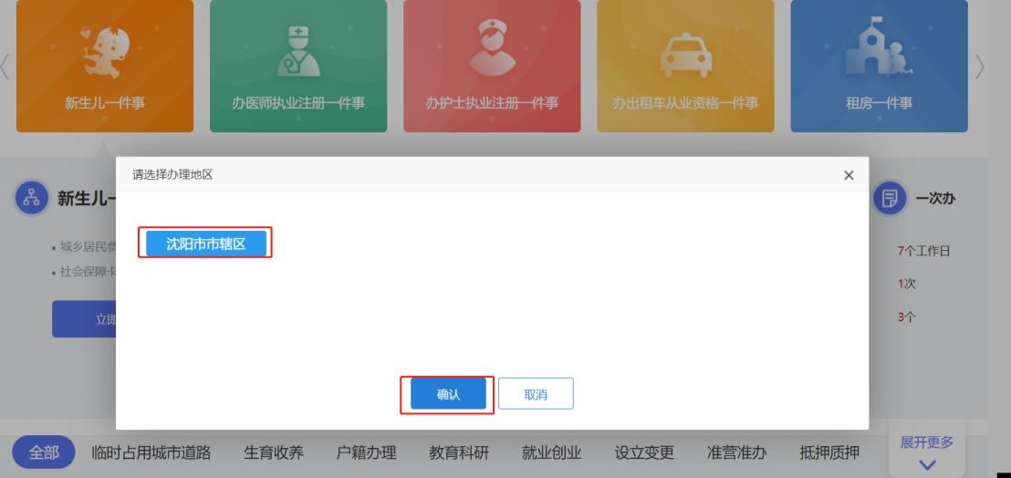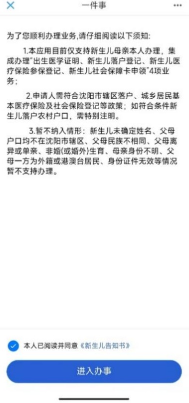 2)登录“沈阳政务服务”APP,首页中进入“一件事”,找到“新生儿一件事”;