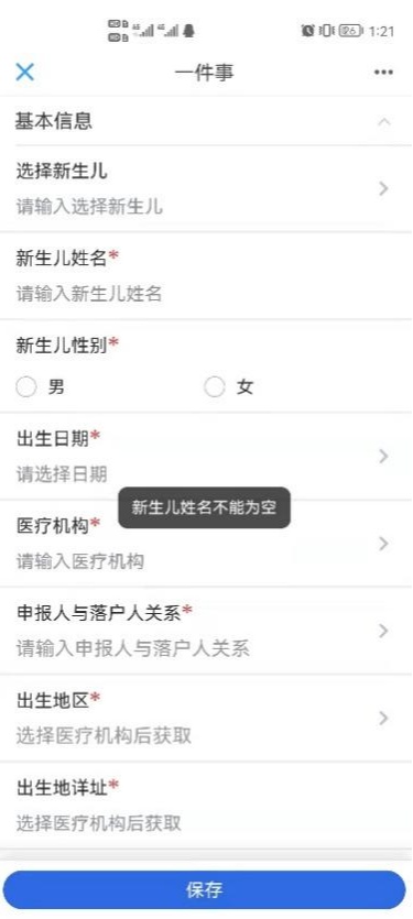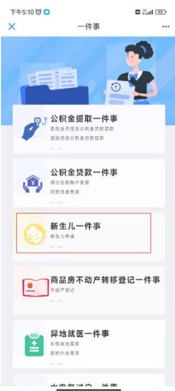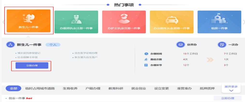 点击“一件事办理”进入专区,找到“新生儿一件事”并点击立即办理;