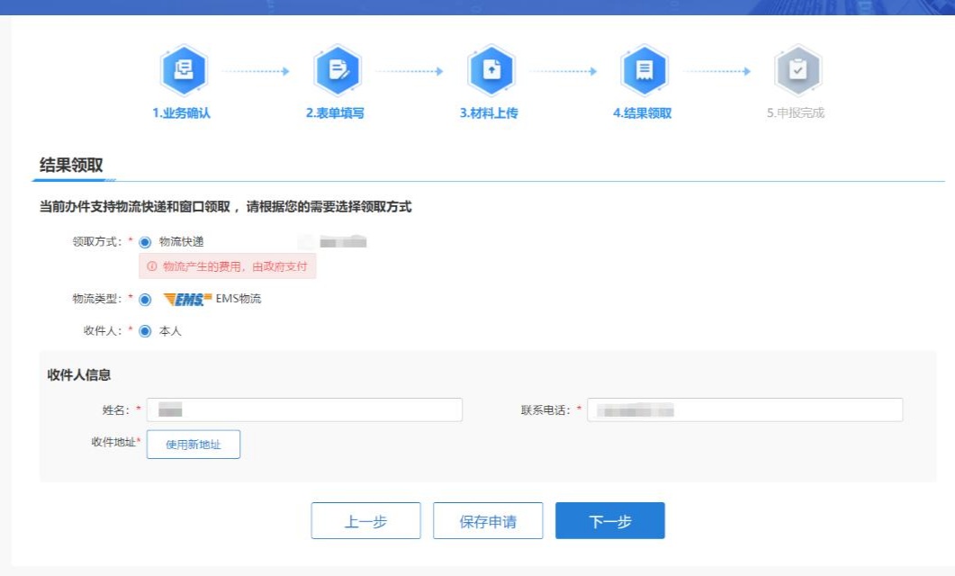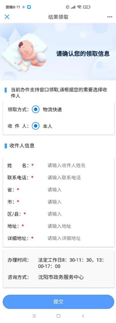 9)按照页面提示填写收件信息,点击“提交”后办理完成。