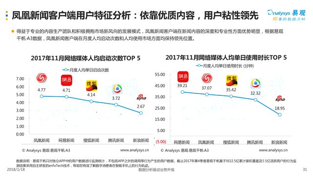 一直以来,凤凰新闻客户端及一点资讯“双轮驱动”抢占移动端流量入口,是凤凰网重要的发展战略。其中凤凰新闻客户端秉持差异化的发展理念,聚焦于新闻资讯用户中的高端人士,致力于为其“创造有品质的内容,提供有看点的信息”。在Analysys易观最新发布的《中国移动综合资讯市场年度分析2018》中,特别强调了凤凰新闻客户端在用户粘性方面的优势。在2017年11月的网络媒体人均启动数统计中,凤凰新闻客户端人均启动4.77次,在移动资讯平台中列第一;人均使用时长37.07分钟,列第二。无论是启动次数还是使用时长,都展现出极强的粘性,体现了用户对凤凰新闻客户端内容的认可与喜爱。