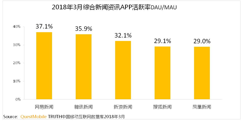 据国内知名移动大数据服务商QuestMobile最新数据显示,2018年一季度,网易新闻“人均单日使用时长”居综合新闻资讯App排行榜第一位,“用户活跃率”(DAU/MAU)高达37.1%,超过腾讯新闻、搜狐新闻、凤凰新闻、新浪新闻等新闻资讯App,位居综合新闻资讯客户端排行榜首。