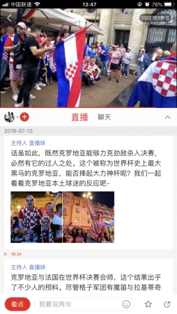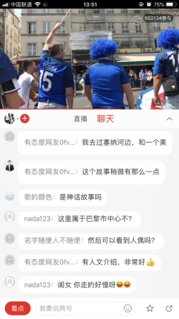 在直播间,网友们也毫不示弱,有网友看到克罗地亚美如画的街道,直接留言道“准备买机票飞过去了”;在巴黎的直播中,网友们甚至直接发起了同城球迷召集活动,相约一起去酒吧看比赛为法国队加油;直播间如果有人询问决赛队伍的情况,也总不乏资深球迷现身说法,为大家科普“关注点”。