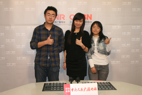中央民族大学广播台长安赵蒙(左)、主播若尘(中)、清华大学广播台台长(右)