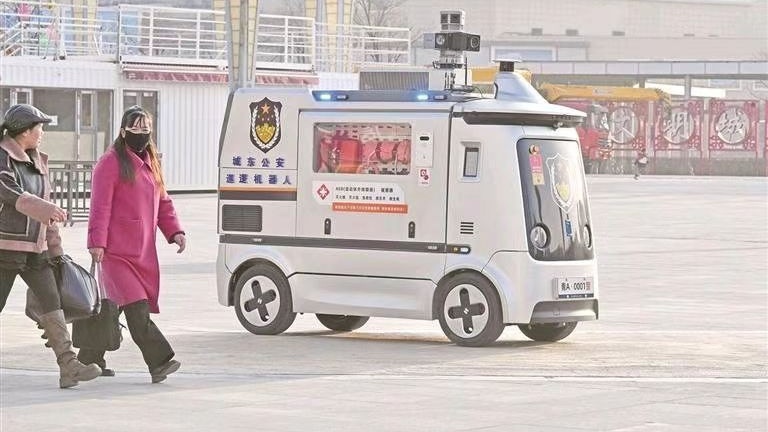 作为全省首个智慧巡逻机器人,它搭载有AED、灭火器等救生、救援、消防、搜救设备,以应对不同场景下的应急需求。车顶配备高清摄像头、激光雷达及红外、声波等多模态传感器。