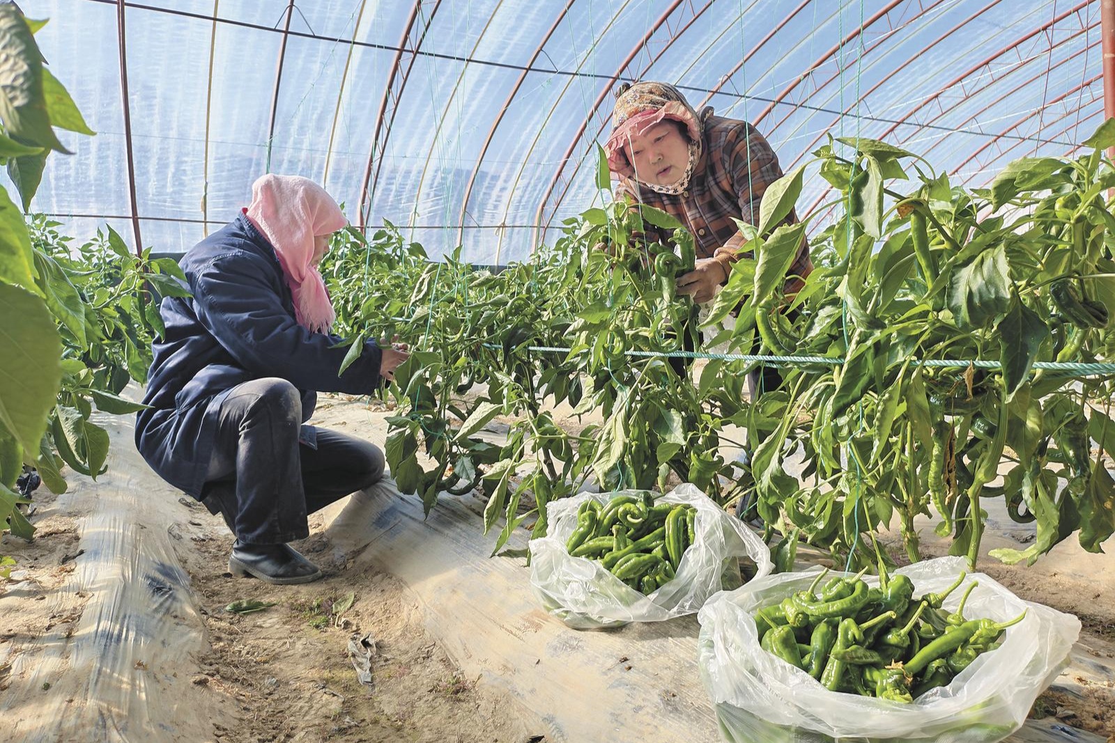 海西蒙古族藏族自治州德令哈市柯鲁柯镇金原村辣椒采摘基地,翠绿欲滴的辣椒挂满枝头,村民正忙着采摘。
