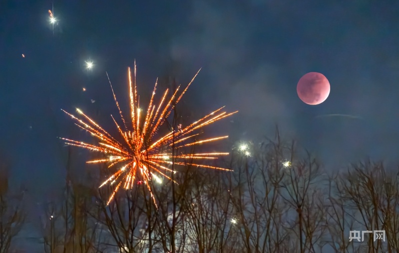 3月3日农历正月十五元宵佳节,月全食带来的“红月亮”与节日烟花相映成辉。