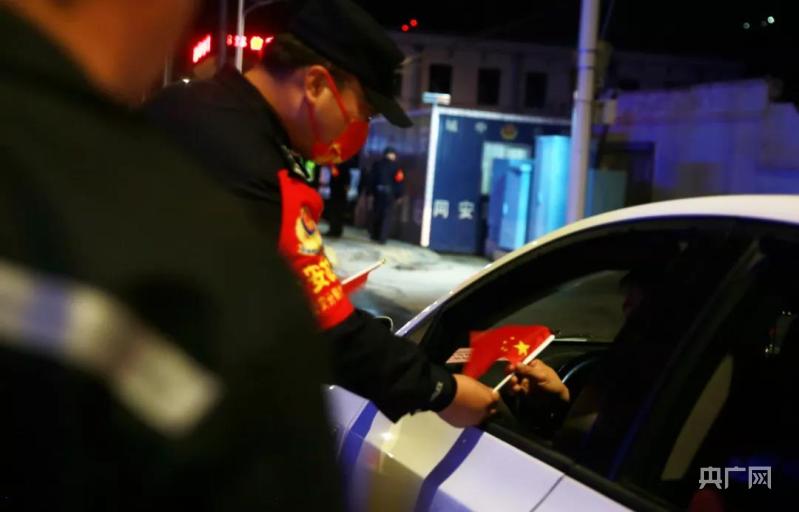 城中公安分局治安检查站民警为过往司机送上国旗,叮嘱节日期间:开车不喝酒,喝酒不开车。(央广网发 西宁公安供图)