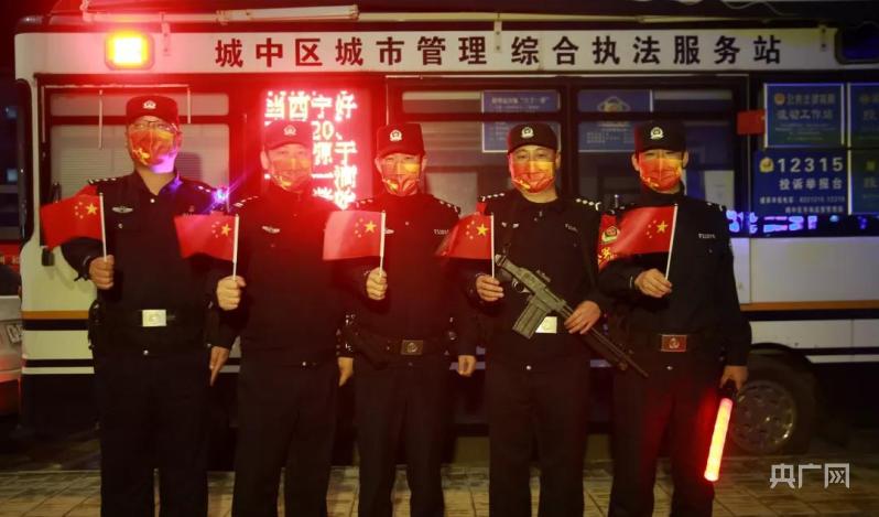 城中公安分局治安检查站检查组在开展夜查工作前,挥动手中的国旗,送上对祖国节日的祝福。(央广网发 西宁公安供图)