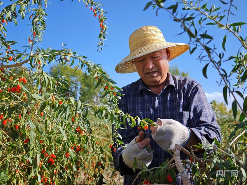 青海省海西蒙古族藏族自治州都兰县的戈壁滩被绵延21.02万亩枸杞林染成绛红。