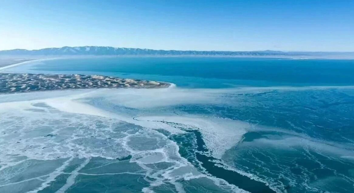 冬日的风掠过祁连山脉,群山银装素裹。望向青海湖,湖水初凝,冰沿蜿蜒,与深蓝的湖面相映。一幅雪山冰湖的壮阔冬景图,正在海北展开。