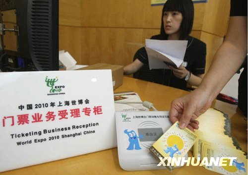 6月30日,在上海一家中国移动营业厅,上海世博会门票业务受理专柜的工作人员展示世博会门票。