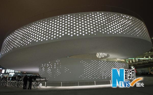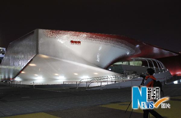 丹麦馆在展示夜景灯光(4月25日摄)。 4月25日,上海世博园举行第五次试运行演练,晚上众多场馆亮灯迎客,流光溢彩的世博园吸引了众多游客。 新华社记者裴鑫摄