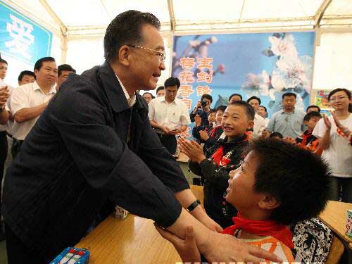 看见可爱的孩子们,温家宝脸上就浮现出了微笑,加快脚步走到他们中间,在一张张小课桌前俯下身去亲切询问孩子们的情况,鼓励他们要坚强。温家宝动情地说:“同学们,我又来了。很高兴,现在你们又有了学习的地方。今后生活的道路还很长,你们必须学好本领,克服困难。相信你们会坚强起来,会成长得更快、更好,更懂得生活,更懂得奋斗。还是那句话,把家乡建设好,把祖国建设好,做一个对人民有用的人。”