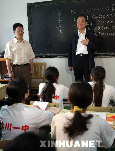 在地震中,北川中学受灾尤为惨重,成了一片废墟。地震发生第二天,温家宝就来到了这里,要求救援队伍加紧营救废墟下的孩子;22日,温家宝重返四川灾区指导抗震救灾,第二次来到正在清理场地、进行卫生防疫的北川中学。23日上午,温家宝又来到设于四川长虹集团培训中心院子里的北川中学临时学校。