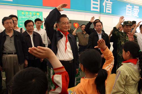 一个小学生手里拿着一条红领巾走过来,温家宝微笑着低头请他戴上。戴着红领巾的温家宝面向全体同学,神情凝重地说:“同学们,让我们一起为遇难的同胞们行个礼吧。”