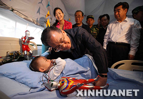5月23日,中共中央政治局常委、国务院总理、国务院抗震救灾总指挥部总指挥温家宝前往四川绵阳404医院看望受伤群众。这是温家宝在监护室看望在地震中受伤的小朋友郎铮。 新华社记者姚大伟摄