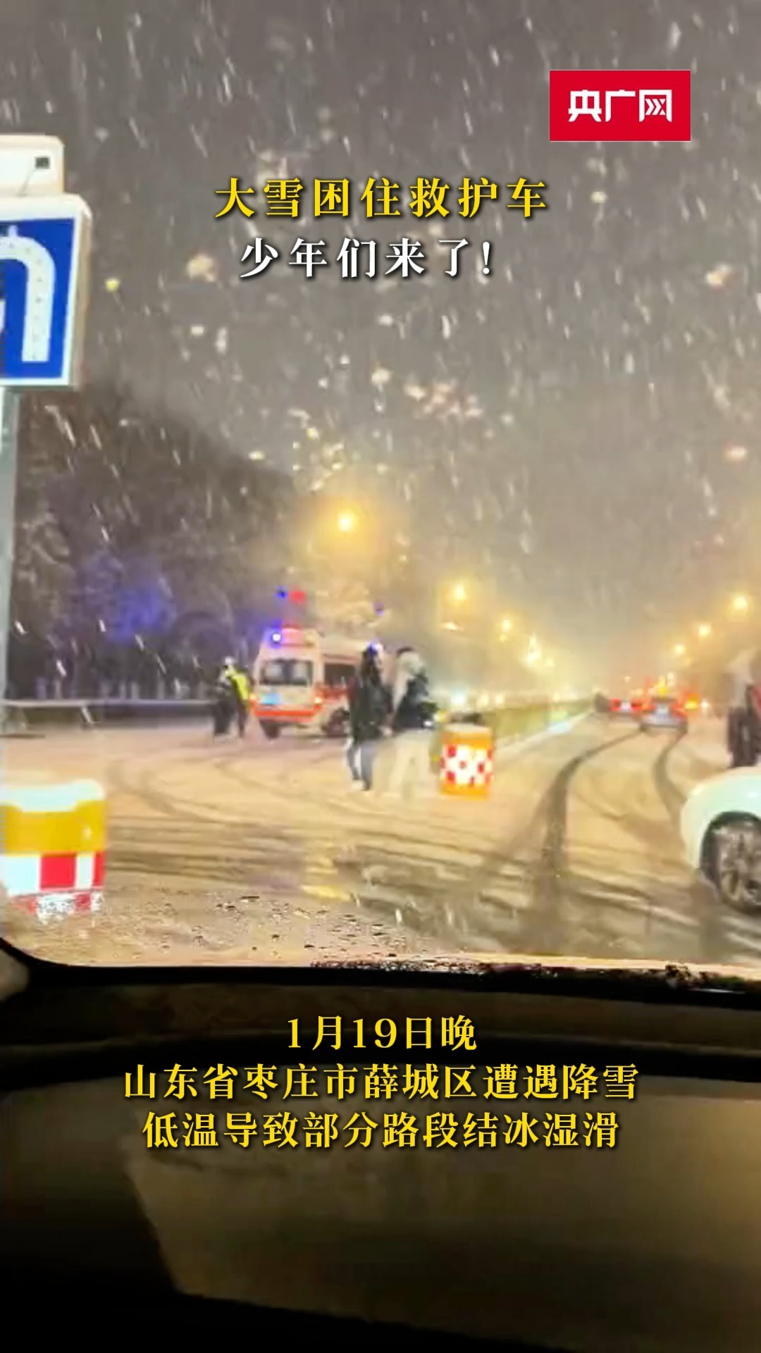 山东枣庄,一辆救护车在前往医院途中打滑被困陡坡,四名身着校服的身影主动上前,与交警一同推车。