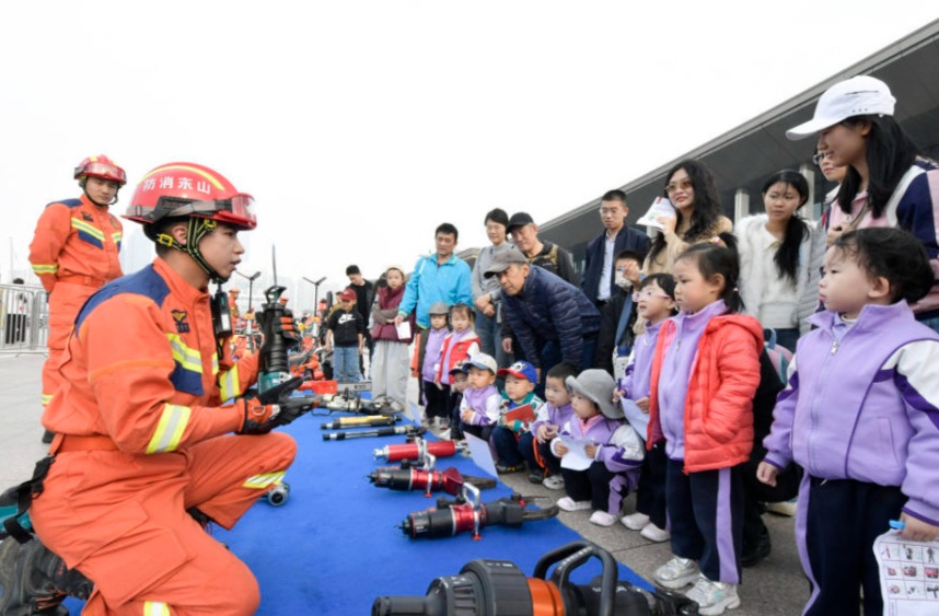 101米国内最高登高平台消防车现身!超1万市民前来打卡,青岛119消防宣传月正式启动
