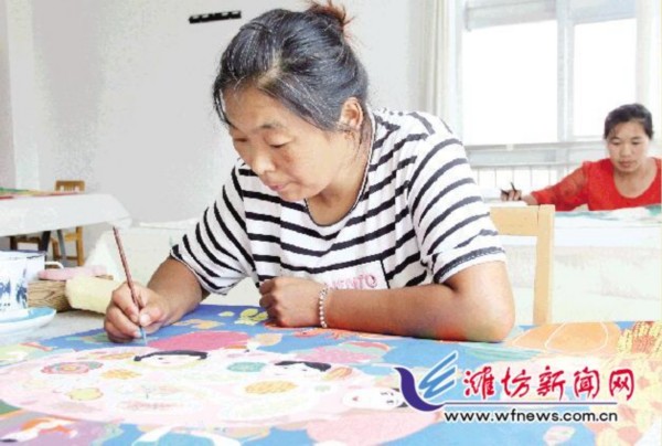 42岁的马玉萍是潍坊青州市弥河镇中黄村人,是一名地地道道的农民。眼下正值农闲时节,以往到了这个时候,像村里大多数家庭主妇一样,聚在村头大槐树下聊聊家长里短是马玉萍的主要消遣方式。如今,她只要一有空就往几里地外的镇政府跑,跟这里的老师们学习农民画创作。