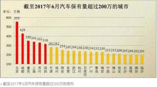 全国有49个城市的汽车保有量超过100万辆,23个城市超200万辆,6个城市超300万辆,其中超过200万辆的23个城市依次是北京、成都、重庆、上海、苏州、深圳、天津、郑州、西安、东莞、武汉、杭州、石家庄、广州、青岛、南京、宁波、佛山、保定、长沙、昆明、潍坊、临沂。