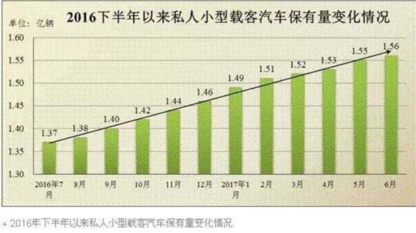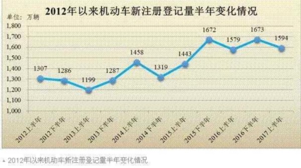 截至6月底,全国机动车保有量达3.04亿辆,与去年底相比,增加938万辆,增长3.18%。2017年上半年机动车新注册登记量达1594万辆,略高于去年同期水平。