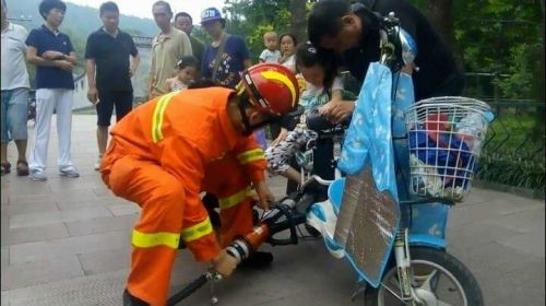2017年8月7日17时13分,济南公安消防英雄山路中队接到119指挥中心命令:英雄山烈士陵园附近,一小女孩的脚被卡在电动车后轮内,情况十分危急。