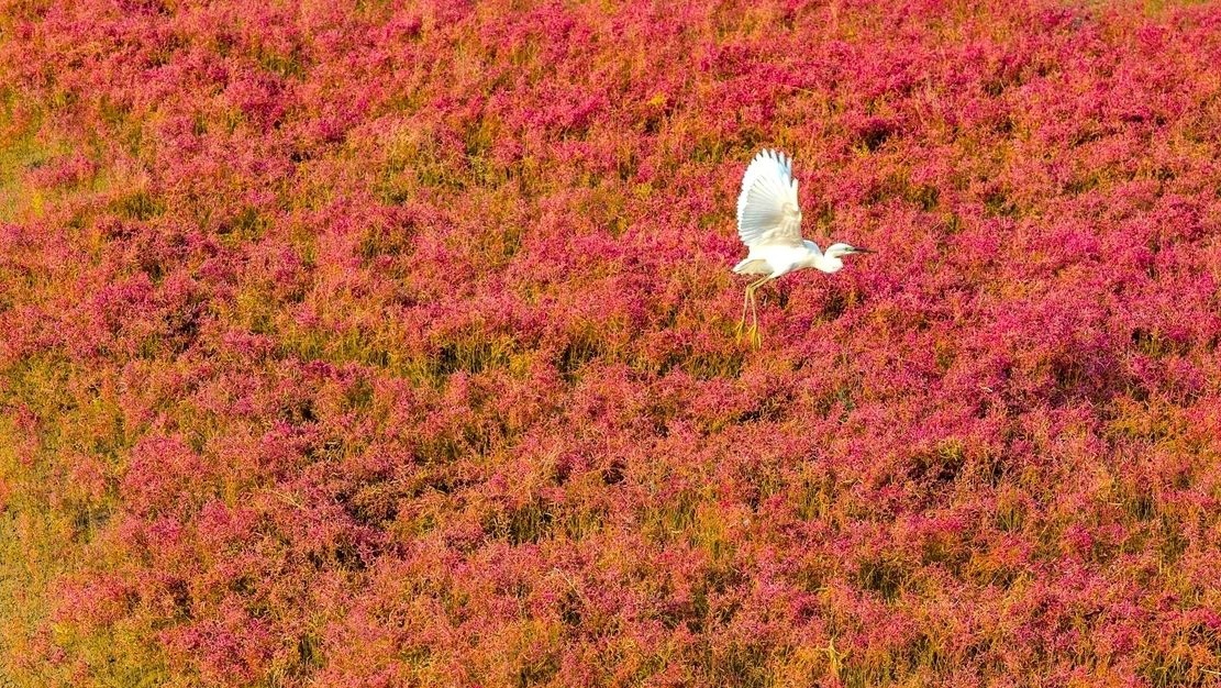 近日,青岛西海岸新区红石崖街道依偎的胶州湾湿地红海滩,迎来一年中的最佳观赏期。