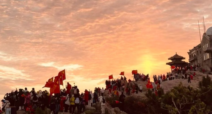 漫山挥舞的国旗与红日、朝霞相映,让“中国红”成为国庆日泰山上最耀眼的色彩。