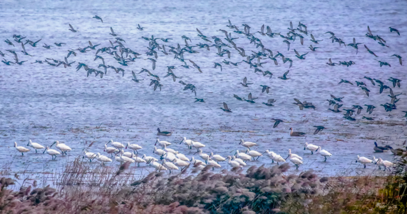 初冬的黄河三角洲,芦荻摇曳成海,青头潜鸭悠然游弋,东方白鹳傲立浅滩,银鸥展翅掠空。