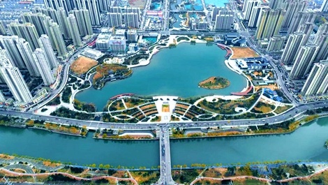 高空俯瞰济南北部城区,云锦湖公园与一路之隔的小清河相映衬,形成一派建筑与自然交相辉映的美景。