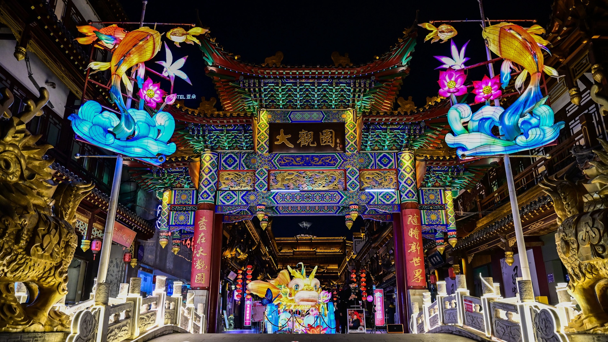近日,夜晚的济南大观园华灯初上,仿古建筑群在彩灯映照下焕发光彩。