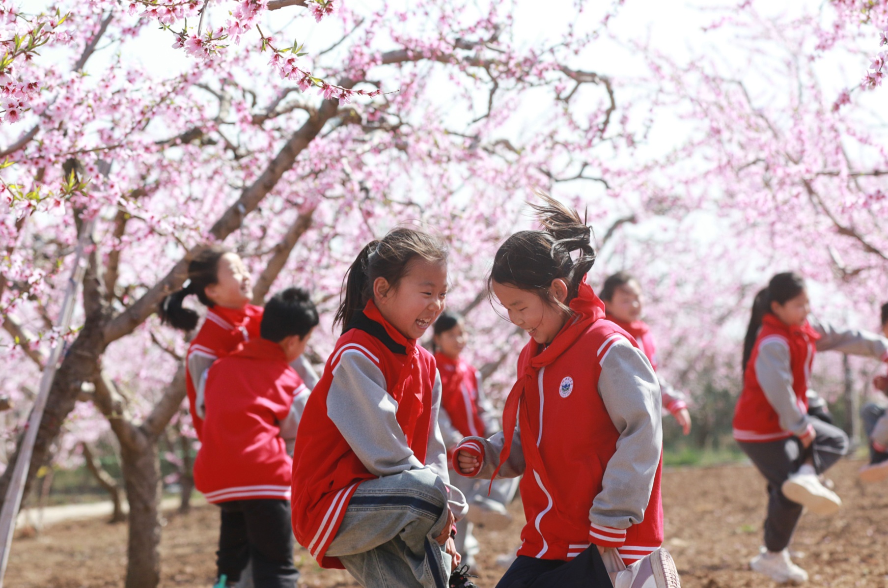 潍坊高密市东北乡东流口子小学将课堂搬进繁花满枝的桃林。