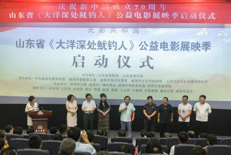 央广网济南8月29日消息 为落实《山东海洋强省建设行动方案》,推动优秀海洋文化创造性转化、创新性发展,增强海洋文化软实力,由中共威海市委宣传部发起,山东省电影局、山东省海洋局等单位联合举办的纪录影片《大洋深处鱿钓人》公益电影放映季启动仪式,于2019年8月27日在山东省威海市成功举办。
