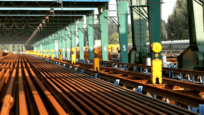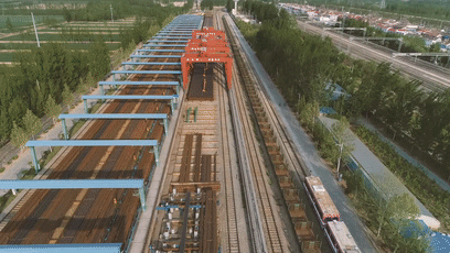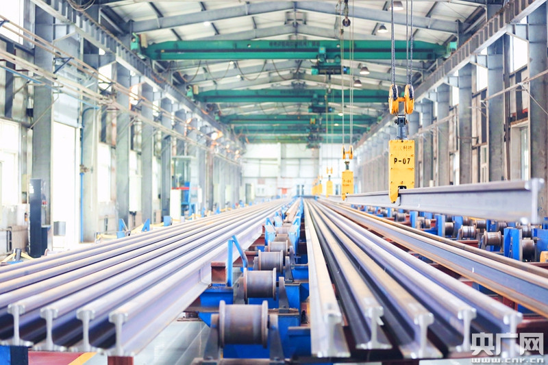 检测完成的钢轨被放在存放台,一排排焊接成品的长钢轨,像充满韧性的“面条”,需要的时候这些钢轨会被头顶大型龙门吊的触手“叼”起来,依次转运到500米长的专用列车上,随后发往高铁铺设现场。