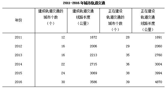 据不完全统计,未来5年世界范围内城市轨道交通的建设80%在中国。《公报》显示,2016年,全国共有39个城市正在建轨道交通,线路长度4870公里,比上年增加1个城市,增长21.9%,车站数3080个,其中换乘站827个。
